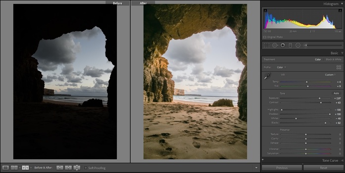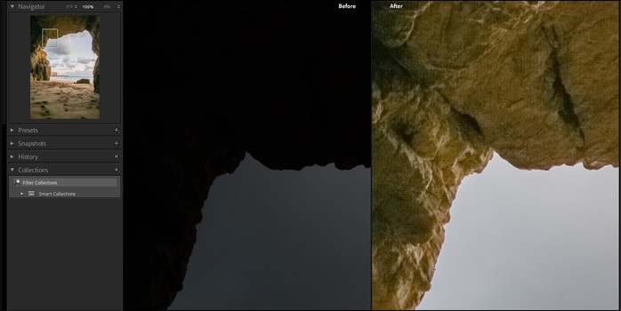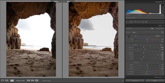 Here, I found a lot of freedom to edit. Uncovering the hidden structure underneath the shadows was no problem, just as getting more detail in the sky was done within a shift of a slider. Even though it wouldn’t necessarily be my preferred way to edit this photograph, local adjustments helped to get a lot of detail back into the lone rock, which seemed to be lost in the JPEG. But was it really? To double-check the JPEG capabilities, I also edited the JPEG file in Lightroom. Much of the detail was still available, too.